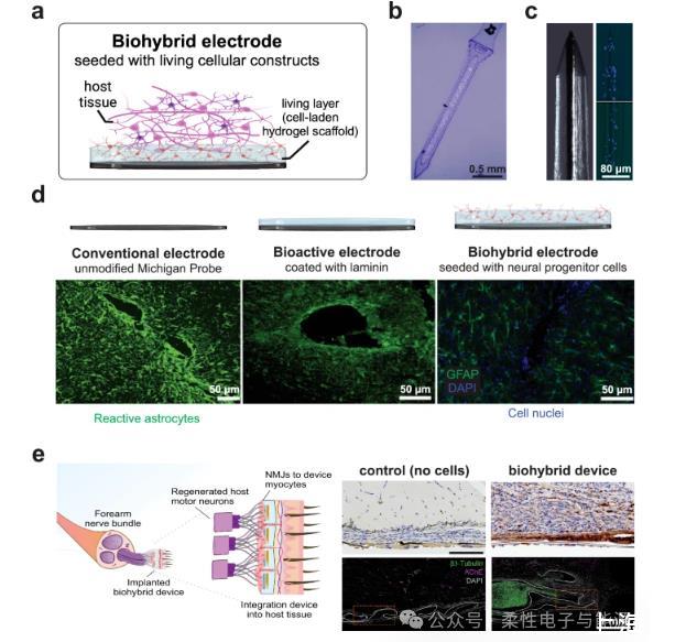 將組織工程與生物電子學結合,通過構建集成宿主細胞的生物平臺可顯著提升神經界面的生物相容性與長期整合性。早期生物混合策略聚焦于活細胞與電子器件的直接結合,例如1988年采用中空玻璃錐包裹金線并嵌入坐骨神經片段的“錐形電極”,其通過促進神經突起長入電極實現長達15個月的穩定記錄,且后續人體臨床試驗顯示植入13年后電極尖端仍存在神經生長而無膠質瘢痕,證明細胞整合系統的優越性遠超單純生物分子涂層。2002年開發的“篩電極”首次將軸突生長容器與微電極結合,利用生物混合裝置中的軸突作為電極與肌肉間的信號中繼,實現了周圍神經損傷后肌肉控制的恢復。近年來,該領域進一步拓展為兩大方向:一是通過細胞外基質(ECM)衍生生物分子修飾電極以增強細胞黏附,二是構建功能性載細胞水凝膠支架,例如在導電聚合物纖維表面直接培養神經元并覆蓋瓊脂糖層固定網絡,形成機械順應性電極陣列;或在柔性微電極陣列上鋪展工程化軸突束,嵌入瓊脂糖基質后植入神經導管,實驗顯示植入體內2周即可誘導宿主軸突再生與血管化,為神經修復提供新路徑。