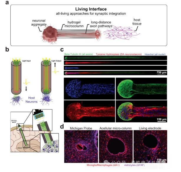 術語“活體電子和接口”指完全由生物衍生材料與活細胞組成的系統,與生物混合設備不同,活細胞不僅提供生物界面層還充當設備內有源輸入/輸出端子,植入物與宿主組織間信息交換主要由活細胞記錄、轉導和調節,利用此方法可開發用于中樞及外周神經系統等體內電活性組織雙向通信的所有活體電極,基本原理是用神經元軸突替代其他導電材料作信號傳感器,將神經元和軸突束包裹引導于水凝膠微柱中,可生物制造準備植入的活體組織工程醫療產品。