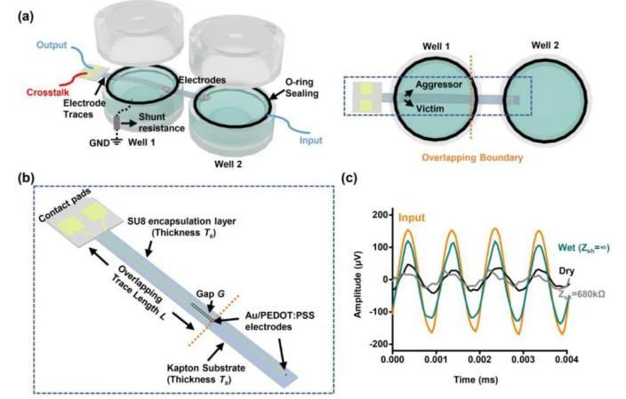 圖1.在潮濕條件下使用雙孔設置對聚合物MEA進行串擾測量。(a)濕法串擾測量裝置示意圖。(b)用于串擾測量的電極配置。(c)與輸入信號(黑色)相比,在不同環境下測量到的串擾波形。