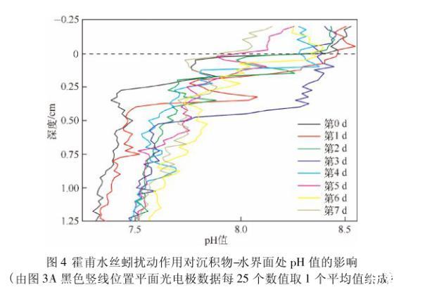圖4霍甫水絲蚓擾動作用對沉積物~水界面處pH值的影響(由圖3A黑色豎線位置平面光電極數據每25個數值取1個平均值繪成)