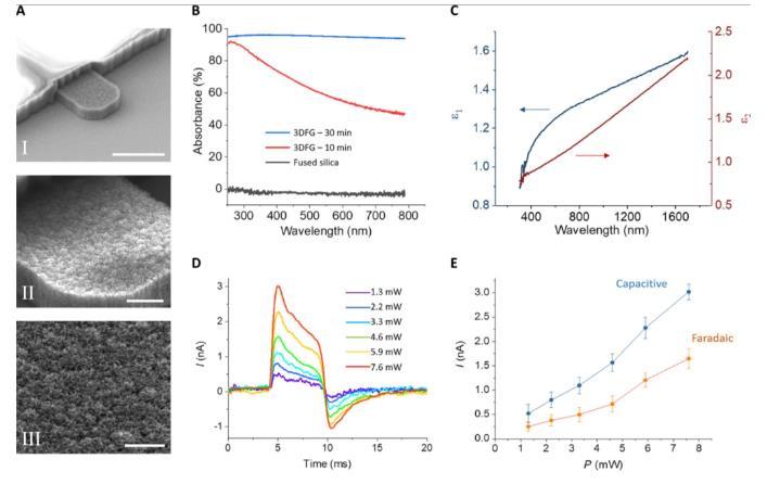 圖1三維多孔金柵(3DFG)的掃描電子顯微鏡(SEM)成像和光學特性表征。(A)5微米3DFG電極的SEM圖像。比例尺:5微米(I)、1微米(II)和0.5微米(III)。(B)熔融石英(灰色)、在800°C下合成10分鐘的3DFG(紅色)和在800°C下合成30分鐘的3DFG(藍色)的紫外-可見光吸收率隨波長的變化。(C)3DFG在可見光和近紅外范圍內的介電常數(shù)的實部(ε1)和虛部(ε2)。(D)在1064納米超快(皮秒)脈沖激光激發(fā)下,3DFG電極與磷酸鹽緩沖液(PBS)界面產生的光電流,激光強度變化時的情況。脈沖序列持續(xù)時間為6毫秒。(E)激光激發(fā)產生的光電流的電容分量和法拉第分量。電容值取激光激發(fā)開始時的最大電流峰值。法拉第值計算為激光脈沖序列結束前最后1毫秒部分的平均值。