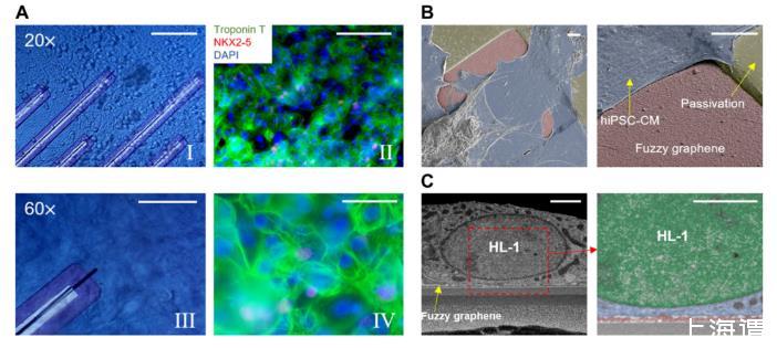 圖2.3DFG MEA-心肌細胞界面。(A)在3DFG-MEAs上培養(yǎng)7天的hiPSC-CMs的明場(I和III)和免疫熒光圖像(II和IV)。比例尺,100微米(I和II)和50微米(III和IV)。(B)hiPSC-CMs在3DFG MEAs上的偽彩色掃描電子顯微鏡圖像。比例尺,5微米。(C)HL-1細胞在3DFG上的橫截面掃描電子顯微鏡圖像。右側圖像顯示細胞核為綠色,細胞質為藍色,3DFG為紅色。比例尺,2微米。