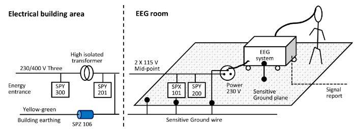 由于微電極具有高阻抗,它們比宏觀電極對偽影更為敏感。最普遍存在的噪聲來自電記錄環(huán)境,尤其是在50/60赫茲頻率下。如果電環(huán)境噪聲過大,信噪比(SNR)可能會不足,進而會妨礙動作電位的檢測。降低數(shù)據(jù)中噪聲的最有效方法首先是預(yù)防或減少噪聲,例如通過改變記錄室的電氣設(shè)置。用于顱內(nèi)檢查的醫(yī)院房間是一棟建于20世紀60年代的建筑的一部分。進行了EMC-ZM(電磁兼容性-零方法)測量,結(jié)果發(fā)現(xiàn)腦電圖記錄室充滿了來自配電系統(tǒng)的噪聲源。因此,在2014年進行了一項名為“低噪聲”的特定電氣安裝,以接近0伏特峰值(Vp)和0安培峰值(Ap),即無電噪聲(圖5)。這項安裝包括以下內(nèi)容: