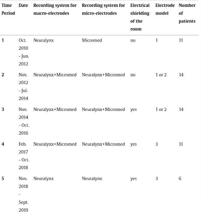 根據(jù)我們記錄程序的改進步驟(新的記錄系統(tǒng)、房間的電屏蔽、強化電極模型),在2010年至2020年期間可以確定五個主要時間段,總結(jié)在表4中。使用廣義線性混合模型(GLMMs)評估不同時間段測量的均方根(RMS)值的變化和多單元活動(MUA)的量化情況。