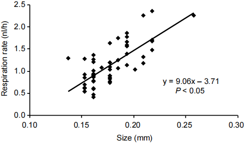 圖5、呼吸速率與第7天體外生產的牛囊胚直徑之間的關系。