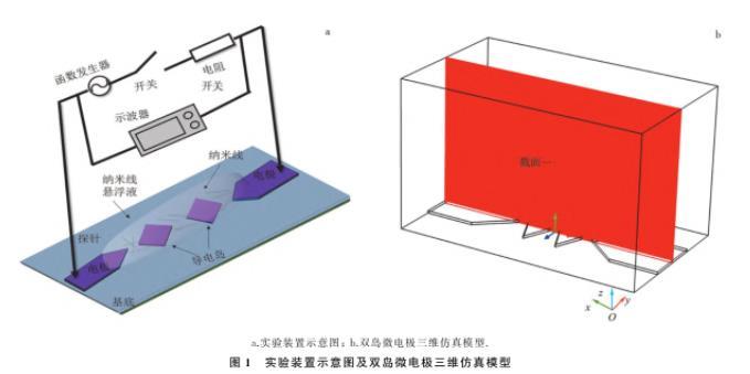 a.實驗裝置示意圖;b.雙島微電極三維仿真模型。圖1實驗裝置示意圖及雙島微電極三維仿真模型