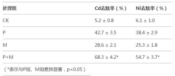 結論:聯合處理(P+M)的Cd/Ni去除率顯著高于單一處理,微生物使植物對Cd的吸收量提高60.2%。