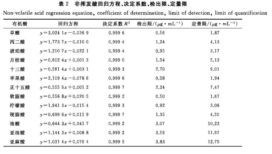 表2非揮發(fā)酸回歸方程、決定系數(shù)、檢出限、定量限