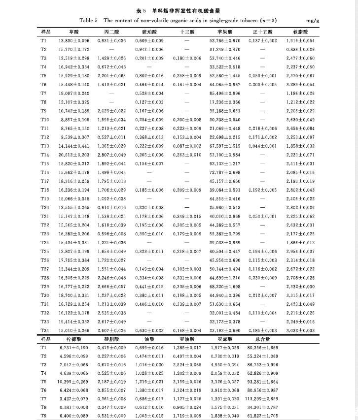 2.1.3樣品的測定卷煙非揮發(fā)性有機酸含量的測定結(jié)果見表4,單料煙非揮發(fā)性有機酸含量的測定結(jié)果見表5。