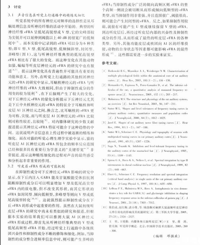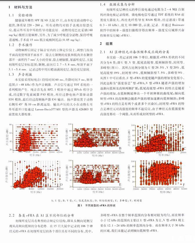 聽覺系統(tǒng)的一個非常重要的構筑特征就是其音頻定位結構",它主要取決于個體神經元對不同范圍內頻率的敏感性。而頻率敏感性則是通過聽覺神經元對聲音的頻率反應域(frequency response area,FRA)來表現(xiàn)的。聽覺上行通路中皮層下的各級核團內神經元的興奮性頻率反應域(excitatory frequency response area,eFRA)呈現(xiàn)出逐級修飾加工的變化。這樣的變化很好的反應了聲音信息在聽覺上行通路中加工,細化的過程。很多文獻對此作了詳細的報道2,3。對貓及蝙蝠初級聽皮層神經元(primary auditory cortex A1)反應特征的研究表明這些動物初級聽皮層神經元的興奮性頻率反應域具有不同的類型,這些不同的類型可能解釋了某些聽覺相關的心理生理學現(xiàn)象。在聽覺功能的研究中,大鼠是應用最為普遍的實驗動物之一,但對它的初級聽皮層神經元興奮性頻率反應域的研究和分析的報道卻很少。因此,本實驗采用大鼠為實驗對象通過細胞外記錄的方法對其初級聽皮層神經元的興奮性頻率反應域進行初步的分析。