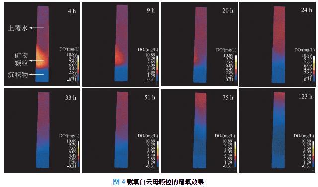 納米氣泡改性白云母顆粒層和顆粒層上覆水體DO濃度的二維空間變化如圖4所示。熒光膜顏色從藍(lán)到白代表DO濃度逐漸上升,可見載氧礦物顆粒層DO濃度顯著高于上覆缺氧水體,開始是3.90 mg/L,逐漸向上覆水中擴(kuò)散,隨時(shí)間變化最后降低為0.05 mg/L,而上覆水界面處DO濃度開始是0.05 mg/L,慢慢增加,最后升至1.70 mg/L.