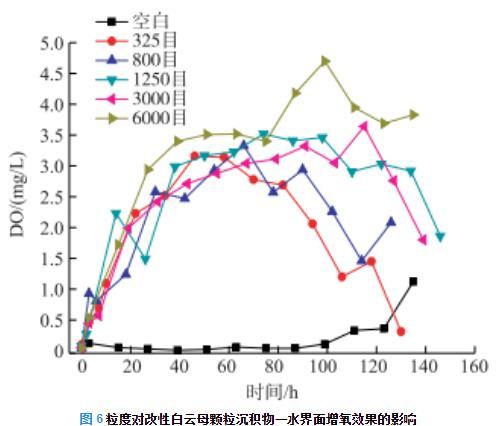 以不同粒度白云母作為基底制備納米氣泡改性顆粒,投入沉積物—水界面后,利用多參數(shù)水質(zhì)監(jiān)測儀獲取界面處DO濃度變化曲線(圖6)。可見,當(dāng)白云母粒度分別為6000、3000、1250、800和325目時(shí),界面DO濃度最大分別可增加4.66、3.59、3.44、3.29和3.06 mg/L.故粒度對增氧效果也有一定影響,顆粒越細(xì),增氧效果越明顯。此結(jié)論與趙婉辰等的研究結(jié)果一致。趙婉辰等向云芝糖肽、平消片、殼聚糖懸浮液中充氧氣制納米氣泡獲得富氧制劑,再用富氧制劑向缺氧水體增氧,最后得出顆粒尺寸相對較小的云芝糖肽增氧幅度最大,尺寸小,比表面積大,有利于納米氣泡的吸附;而納米尺寸的殼聚糖富氧制劑增氧幅度最小,是因?yàn)闅ぞ厶橇6刃∮诩{米氣泡本身,不利于納米氣泡的吸附。