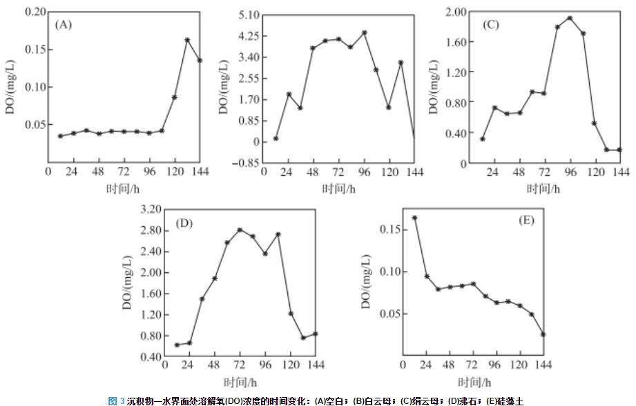 圖3沉積物—水界面處溶解氧(DO)濃度的時(shí)間變化:(A)空白;(B)白云母;(C)絹云母;(D)沸石;(E)硅藻土