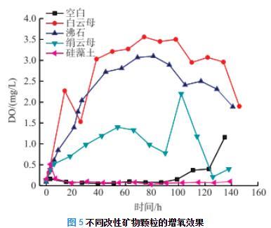 2)不同礦物的界面增氧效果差異顯著。其中,改性礦物白云母表現(xiàn)出較好的增氧性能。其次,礦物粒度越細(xì),界面增氧效果越好,持續(xù)增氧時(shí)間也越長。