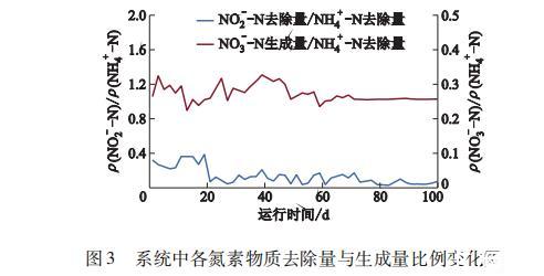 系統(tǒng)去除的亞硝酸鹽氮與氨氮的質量濃度之比在1.00——1.25之間,同時系統(tǒng)生成的硝酸鹽氮與去除的氨氮質量濃度之比在0.044上下波動(見圖3);這兩個比值均小于厭氧氨氧化反應化學計量式中的理論比值(式1)。據此推斷,系統(tǒng)中除厭氧氨氧化反應外,可能還存在反硝化反應,厭氧氨氧化過程中生成的部分副產物硝酸鹽氮發(fā)生了反硝化作用,轉化成為亞硝酸鹽氮或氮氣。