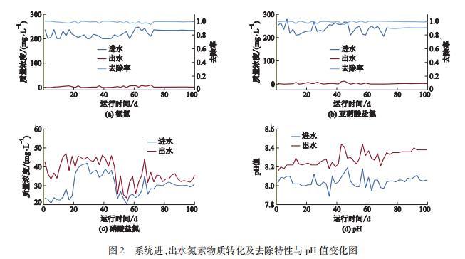 圖2系統(tǒng)進、出水氮素物質轉化及去除特性與pH值變化圖