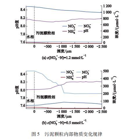 當基質中只含有亞硝酸鹽氮時(見圖5a),亞硝酸鹽的濃度持續(xù)降低,氨氮和硝酸鹽氮的變化甚微,pH值略有增加,說明反硝化菌以亞硝酸鹽氮為電子受體發(fā)生了內源反硝化反應;當基質中只含硝酸鹽氮時(見圖5b),顆粒表層區(qū)域(0——1200μm),硝酸鹽濃度減少,亞硝酸鹽濃度略微增加,說明此段因缺乏氨氮和亞硝酸鹽氮致使厭氧氨氧化菌活性受到抑制,發(fā)生了將硝酸鹽氮還原為亞硝酸鹽氮的反硝化。顆粒污泥內部1200μm到2500μm區(qū)域內,亞硝酸鹽氮濃度減小,硝酸鹽氮濃度變化甚微,說明發(fā)生了反硝化反應。