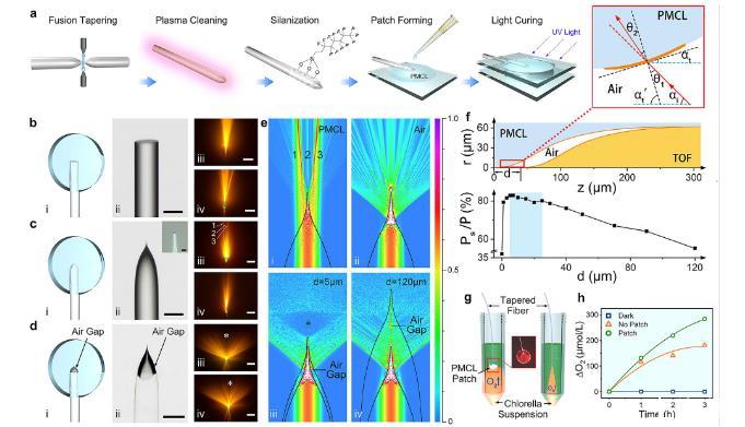 圖2、iCarP的制備和光散射性能。a TOF在PMCL貼片中的制備。產(chǎn)生了一個(gè)空氣間隙以獲得iCarP。b–d平面光纖光子器件(FEOF)(b)、嵌入PMCL貼片中的TOF(c)和iCarP(d)。(i)器件的示意圖,(ii)器件的顯微圖(代表性大于3個(gè)器件),比例尺=100微米,c的插圖:錐形光纖尖端,比例尺=2微米,(iii、iv)器件的正視圖(iii)和側(cè)視圖(iv)以及激發(fā)的熒光,比例尺=5毫米。*表示iCarP正向方向的暗區(qū)域。比例尺=5毫米。e光子器件發(fā)出的光的模擬電場強(qiáng)度分布,(i)PMCL中沒有空氣間隙的TOF,(ii)空氣中的TOF,(iii)具有d=5微米的iCarP,(iv)具有d=120微米的iCarP。f頂部:iCarP中空氣間隙和TOF尖端的軸對稱橫截面圖,底部:橫截面的百分比光功率(Ps)與總功率(P)之間的關(guān)系以及d的關(guān)系,插圖:局部光路圖,(z:TOF尖端到空氣間隙尖端的距離;αt:空氣/PMCL界面的切線平面與TOF軸向方向之間的角度;αt’:切線平面法線與TOF軸向方向之間的角度;αi:入射光的發(fā)散角;θ1:空氣側(cè)的入射角;θ2:PMCL側(cè)的折射角;P:空氣間隙的總光功率;Ps:正向傳播區(qū)域的光功率)。g iCarP照明誘導(dǎo)的嘧啶藻氧產(chǎn)生的檢測方案:iCarP(左)和TOF(右)處于“開啟”狀態(tài),浸入嘧啶藻懸浮液(綠色),并監(jiān)測氧產(chǎn)生。h iCarP或TOF照明誘導(dǎo)的嘧啶藻氧累積產(chǎn)生,以及在黑暗中。