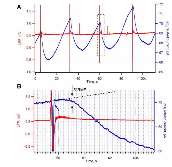 圖2、氧分壓(PO2)探頭延遲時間的評估。采用離體完整海馬組織,通過荷包牡丹堿誘導癲癇樣放電(EDs)。A:7日齡小鼠海馬組織在10μM荷包牡丹堿誘導EDs(紅色曲線)期間的氧相關電流信號(藍色曲線)。B:為評估每次ED與氧消耗起始之間的時間延遲,從氧信號中減去基線斜率(黑色虛線)。消耗起始點定義為:經基線校正后的氧相關電流振幅達到基線噪聲均方根(RMS)振幅5倍時的時刻(黑色箭頭)。