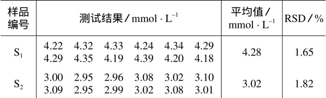 按照1.2實(shí)驗(yàn)方法,取兩份海洋沉積物孔隙水樣品,每份樣品分別測(cè)試12次,對(duì)測(cè)試結(jié)果進(jìn)行統(tǒng)計(jì),結(jié)果見表1。由表1可知,其測(cè)定結(jié)果的相對(duì)標(biāo)準(zhǔn)偏差(RSD)分別為1.65%,1.82%,均小于2%,說明方法的精密度較高。