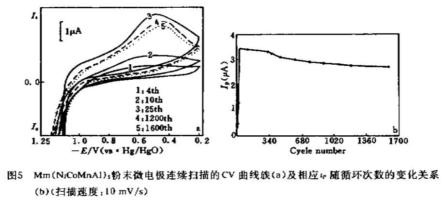 從圖5b可以看到,經過25次循環,電極容量達到峰值,然后開始衰減,循環1600次后容量下降到最大值的70%左右。為進一步檢驗該方法的可靠性,我們采用Mn量為12和4.3(wt%)的兩種Ml(NiCo TiMn)5合金A和B進行驗證。在循環100周時,I P,A/I P,B=1.37,A樣的貯氫容量明顯高于B樣。當I P衰減至最大值的70%時,A樣的循環次數為900次,而B樣的循環次數達1800次,說明Mn含量高的合金較之Mn含量低的循環性差。這些結果與常規尺寸電極充放電循環結果一致【5].然而,對粉末微電極來說,進行1周循環僅需至多幾分鐘,在一天時間內即可進行近千次循環,完成一個樣品循環性能的基本評價。