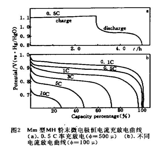 圖2 Mm型MH粉末微電極恒電流充放電曲線(a)。0.5 C率充放電(φ=500μ)(b)。不同電流放電曲線(φ=100μ)