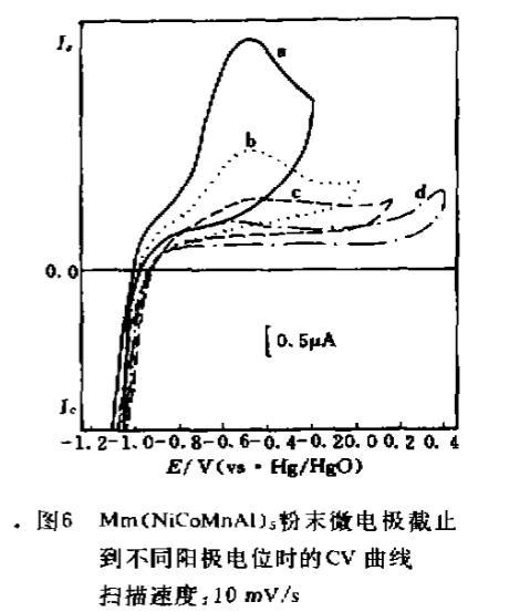 MH負極在化成時常需要適當的過放電,而過放電容易導致MH氧化使貯氫性能不可逆損失,因此需要嚴格控制MH的電位。圖6是Mm(NiCoMnAl)5微電極陽極掃描至不同正電位時的CV曲線??梢钥闯觯灰娢徊怀^~0.20 V,MH負極表現出正常的放電容量和良好的循環性,一旦電位正移至~0.1 V,MH電極的放電容量呈不可逆損失,當電位正于0伏以后,MH電極完全喪失貯氫能力。通過CV掃描可以清楚地確定MH合金材料的抗氧化能力。此外,通過微電極CV法也能夠簡便明確地用于選擇貯氫合金材料的活化方法和評價活化效果。