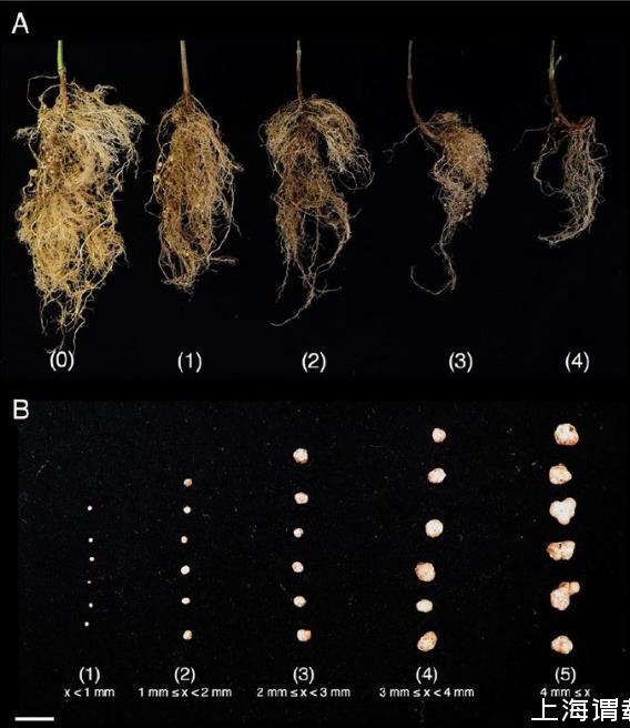 圖1、用于對根腐病嚴重程度和根瘤大小進行評級的序數量表。(A)根腐病嚴重程度量表,其中(0)表示健康且無癥狀的根,(1)表示主根和以后的根壞死少于20%,(2)表示主根和以后的根壞死少于40%,壞死可能到達基部莖,(3)表示主根、側根的壞死少于60%,壞死到達基干,(4)表明主根、側根的壞死少于80%,壞死強烈發生在基干上。(B)結節大小量表,其中×表示測量樣本,順序評分根據直徑進行評分。