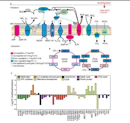 圖4、酸化對細菌硝化細菌的響應。描述酸化對參與氨的逐步氧化(NH?→NH?OH→NO→NO??→NO??)、N?O產生、能量生成和細胞內pH穩態的基因表達影響的示意模型。由虛線表示膜的破裂,因為亞硝酸鹽氧化作用通常不會與氨氧化作用發生在同一有機體內,除了最近發現的共氨氧化Nitrospira外。相對基因表達的變化(FC)通過將酸化樣本與環境對照組進行比較計算。羅馬數字表示呼吸鏈中的酶復合物I(NADH脫氫酶)、復合物III(細胞色素bc1復合物)、復合物IV(細胞色素c氧化酶)和復合物V(ATP合成酶)。虛線藍色箭頭表示電子的移動。E,未知酶。b.酸化對通過Calvin循環和還原三羧酸(rTCA)循環固定CO?基因表達的影響。蛋白質圖標中心的顏色表示基因轉錄本編碼這些蛋白的上調或下調程度。蛋白質圖標外圍的顏色與(c)中的條形圖顏色相對應。c.如(a)和(b)所示的蛋白質編碼轉錄本的FC變化。