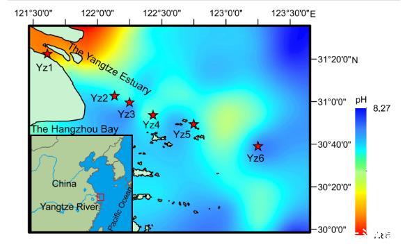 圖1、研究區域和采樣地點,疊加在近底水pH值圖上。各站點用紅色星號標記