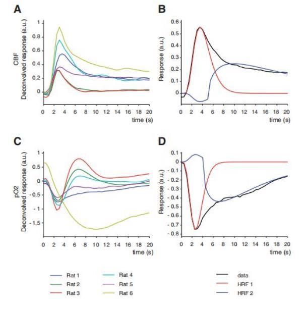 圖5、血流動(dòng)力學(xué)與代謝響應(yīng)函數(shù)(HRF)。A:通過反卷積計(jì)算獲得的各只大鼠CBF脈沖響應(yīng)函數(shù)。B:基于大鼠1的CBF響應(yīng)(黑色),擬合的gamma函數(shù)HRF1(紅色)和HRF2(藍(lán)色)。C:所有大鼠經(jīng)反卷積獲得的PO2響應(yīng)。D:大鼠1的PO2響應(yīng)擬合gamma函數(shù)。需注意大鼠間存在顯著變異(體現(xiàn)在響應(yīng)幅值及后半段形態(tài)差異:CBF表現(xiàn)為向基線的漂移,PO2則出現(xiàn)超調(diào))。ED發(fā)生時(shí)刻定義為時(shí)間0。