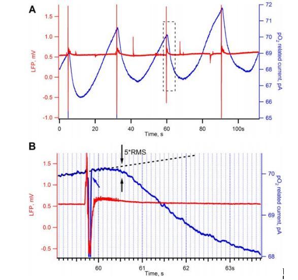 圖2、氧分壓(PO2)探頭延遲時(shí)間的評(píng)估。采用離體完整海馬組織,通過荷包牡丹堿誘導(dǎo)癲癇樣放電(EDs)。A:7日齡小鼠海馬組織在10μM荷包牡丹堿誘導(dǎo)EDs(紅色曲線)期間的氧相關(guān)電流信號(hào)(藍(lán)色曲線)。B:為評(píng)估每次ED與氧消耗起始之間的時(shí)間延遲,從氧信號(hào)中減去基線斜率(黑色虛線)。消耗起始點(diǎn)定義為:經(jīng)基線校正后的氧相關(guān)電流振幅達(dá)到基線噪聲均方根(RMS)振幅5倍時(shí)的時(shí)刻(黑色箭頭)。
