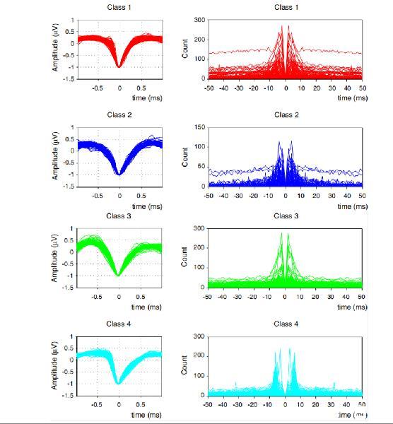 圖4、神經(jīng)元分類為假定主細(xì)胞(PCs)與中間神經(jīng)元(INTs)。左圖:基于主成分分析的四類神經(jīng)元波形圖。右圖:對(duì)應(yīng)的自相關(guān)直方圖(ACG)。