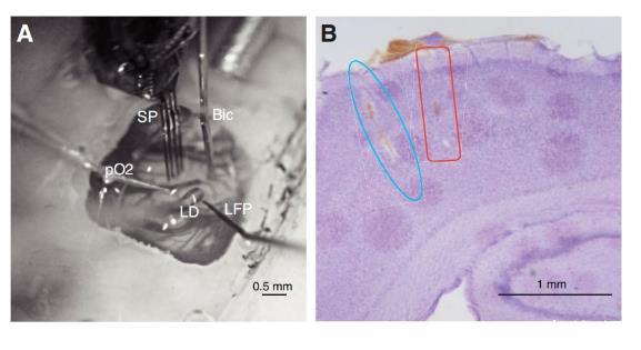 圖1、A:展示大鼠癲癇樣放電(EDs)模型活體同步記錄實(shí)驗(yàn)設(shè)置的顱骨開窗照片。該模型通過體感皮層注射荷包牡丹堿(Bic)誘導(dǎo),實(shí)驗(yàn)裝置包括:用于多單元電活動(dòng)(MUA)記錄的硅探針(SP)、記錄局部場(chǎng)電位(LFP)的鎢電極、監(jiān)測(cè)腦血流量(CBF)的激光多普勒探頭(LD)以及檢測(cè)組織氧分壓(PO2)的氧探頭。B:尼氏染色腦切片顯示記錄區(qū)域,標(biāo)注注射位點(diǎn)(藍(lán)色橢圓)及硅探針單側(cè)電極排的植入位置(紅色方框)。