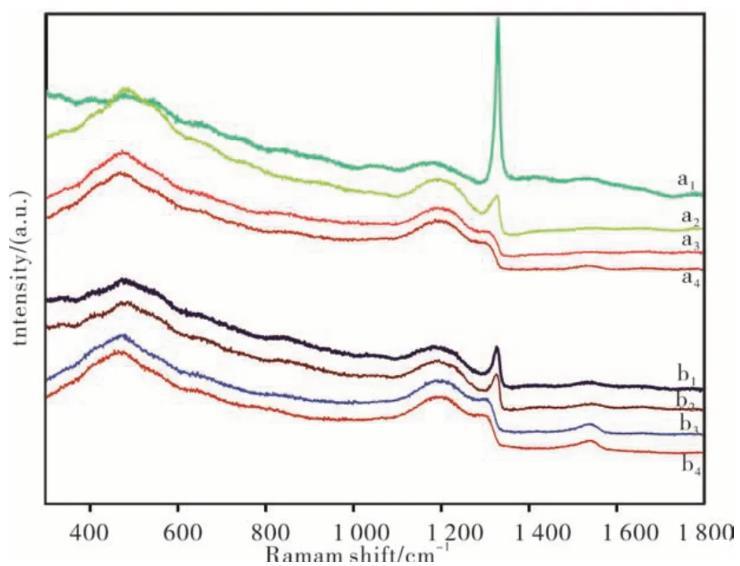 圖3為不同沉積參數下BDD薄膜的Raman光譜圖,其中a1—a4為溫度700℃、摻雜量分別為0.2、0.4、0.8和1.2 mL·min-1,b1—b4為溫度800℃,摻雜量分別為0.2、0.4、0.8和1.2 mL·min-1。