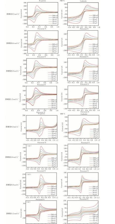 從圖4可以看出:當沉積溫度為700℃時,As-grown狀態下的微電極在不同的掃描速率下,不同摻硼濃度電極的CV曲線均具有峰形對稱的成對氧化還原峰,并且隨掃描速率增大氧化還原峰電流增大,而陽極(Epa)和陰極(Epc)峰電位基本不變,表明電極表面進行的電化學反應具有良好的可逆性;隨摻硼濃度的增大,As-grown狀態下氧化還原峰型和峰電位差(ΔEp)未發生變化;經過陽極和陰極極化后,Cathodic狀態下的電極CV曲線相對As-grown狀態下的CV曲線發生了顯著的變化,特別是硼摻量越少變化越明顯;當摻硼量為0.2和0.4 mol·L-1時,氧化還原峰的峰形出現了不對稱,雖然峰電流隨掃描速率增大而增大,但陽(陰)極峰電位Epa(Epc)朝著正(負)電位方向漂移,電極表面發生準可逆電化學反應;當摻硼量進一步增大到0.8 mol·L-1時,氧化還原峰型基本對稱,峰位隨掃描速率的變化有輕微的變化;當摻硼量達到1.2 mol·L-1時,峰型和峰位與As-grown狀態一樣,峰型對稱,并且氧化還原峰位不隨掃描速率的變化而變化;800℃沉積的BDD微電極電化學性能隨摻硼量的變化規律與700℃微電極的規律的基本一致,但800℃不同電極經過極化后背景電流變小,這主要是電化學極化凈化了電極表面;當摻硼量為1.2 mol·L-1時,由于摻硼量過多使電極表面的形貌異常,導致其CV曲線經過極化后變化異常,背景電流變得很大,這是由于800℃沉積得到的薄膜主要是由大的光滑的(100)面組成,而700℃時薄膜的表面形貌主要是由一些粗糙的(111)面形成的葉層狀的晶粒組成,但是兩者電化學性能變化規律一致,與摻硼量呈現明顯相關性,進一步說明在這種體系中陰極極化氫化的程度主要受摻硼量的影響。