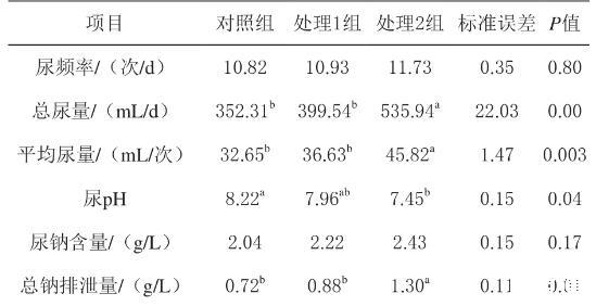 由表3可知,處理3組綿羊尿液總量和平均尿量較其他兩組顯著提高(P<0.05),而對照組和處理1組對這兩個指標的影響無顯著差異(P>0.05)。處理2組較對照組顯著降低了尿液pH(P<0.05)。各處理間排尿次數、尿鈉濃度均無顯著差異(P>0.05)。