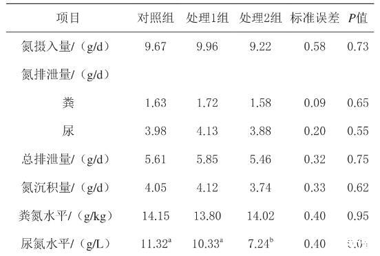 由表4可知,處理2組尿液氮濃度顯著低于對照組和處理1組(P<0.05)。各組對氮攝入量、總氮排泄量和氮沉積量的影響無顯著差異(P>0.05)。