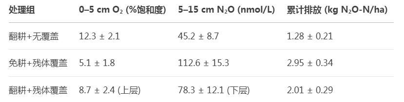 免耕+覆蓋組合O?最低,N?O排放最高(反硝化主導)。