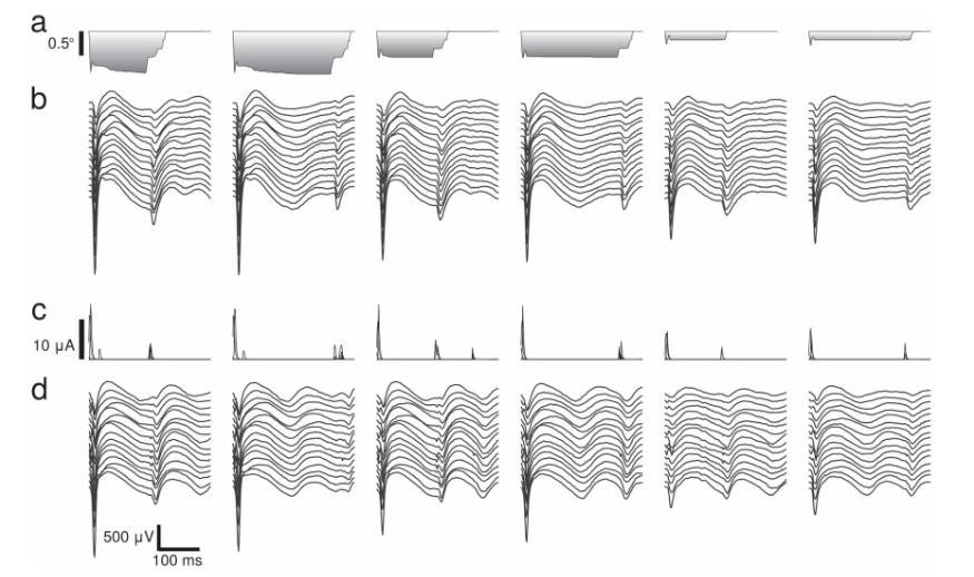 圖4.單個觸摸部位六種觸摸模式的觸摸開始后試驗平均LFP軌跡。(a)試驗平均觸覺器角度位置(負值表示向皮膚方向)。頂部圖的陰影部分對應執行器與皮膚接觸的時間段。(b)對自然觸摸的平均多通道LFP反應,每條曲線代表一個S1記錄通道。通道按該觸摸部位的整體反應幅度排序。(c)優化微刺激,每條曲線代表一個不同的刺激通道。(d)平均微刺激LFP反應。圖6.(a)和(b)自然觸摸與虛擬觸摸的空間反應拓撲。每個像素對應一個記錄電極,顏色表示LFP強度(定義為響應窗口0–300 ms內的最大負電壓)。(c)體內自然觸摸與優化ITMS的通道平均幅度比較。每個點代表一個唯一的觸摸部位/模式組合。(d)優化ITMS的模型再現準確性(相關系數)與體內實際準確性的比較。每個點對應一種觸摸條件,觸摸部位按顏色編碼(見插圖)。