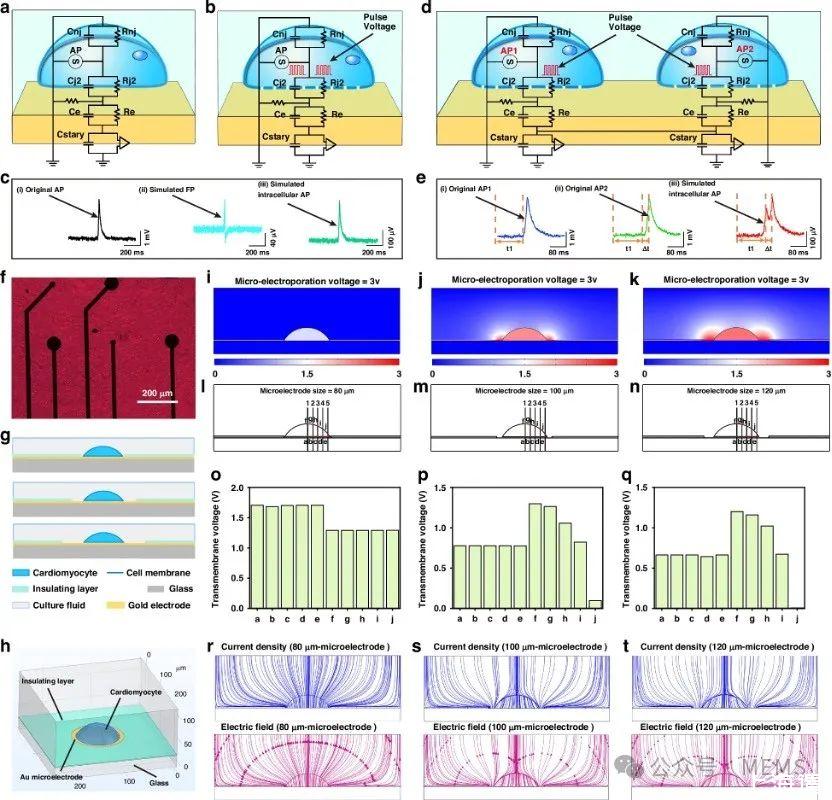 在這項工作中,研究人員介紹了不同微米尺寸的微電極對細胞內AP信號質量和細胞內記錄指標參數的影響。首先,研究人員通過無源電路仿真建模確定,在降低細胞膜阻抗的情況下,電穿孔后使用平面電極記錄的心肌細胞電生理信號波形與細胞內AP波形一致。接下來,研究人員通過三維仿真模型優化了電穿孔電壓,并探討了電極尺寸對跨膜電壓、電流密度和電場強度的影響。