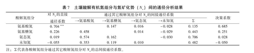 表7土壤酸解有機氮組分與氮礦化勢(No)間的通徑分析結果