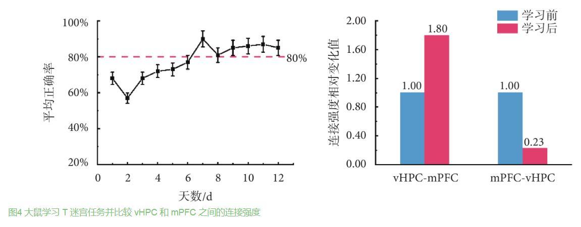 圖4大鼠學(xué)習(xí)T迷宮任務(wù)并比較vHPC和mPFC之間的連接強(qiáng)度