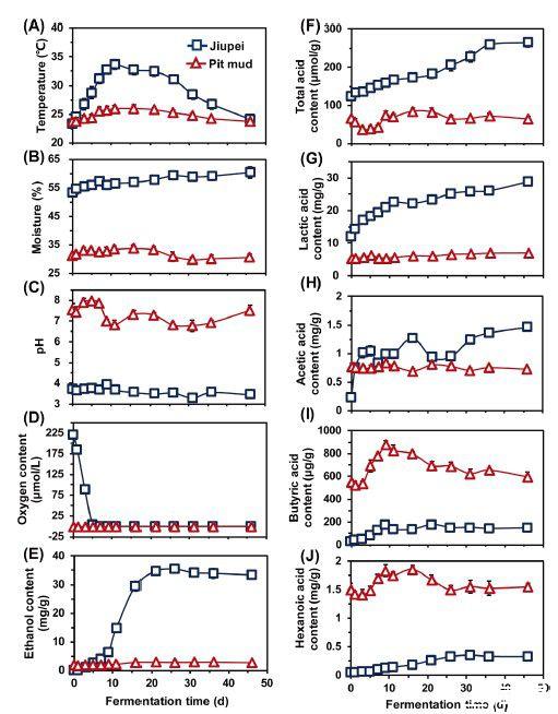 泥窖長期以來一直被用作中式濃香白酒發(fā)酵的厭氧生物反應器,其中淀粉原料(主要是高粱)被多物種微生物代謝成乙醇和各種風味化合物。發(fā)酵谷物和坑泥是泥窖中兩個空間相關的微生物棲息地,但它們的代謝分工仍不清楚。在這里研究人員研究了發(fā)酵過程中發(fā)酵谷物和窖泥中環(huán)境變量(如溫度、氧氣、pH值)、關鍵代謝物(如乙醇、有機酸)和微生物群落的變化。酒胚(發(fā)酵谷物)(低pH值、高乙醇)和窖泥(中性pH值)為微生物生長提供了兩個環(huán)境條件截然不同的棲息地。乳酸在發(fā)酵谷物中積累,而丁酸和己酸主要由棲息在窖泥中的微生物產(chǎn)生。