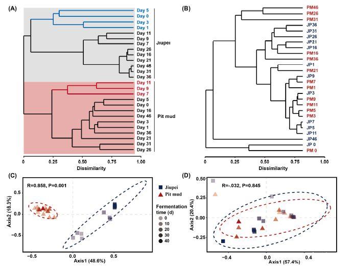 圖3、發(fā)酵谷物和窖泥微生物群落的β多樣性。酒窖聯(lián)盟的UPGMA聚類分析和PCoA分析。(A,C)細菌,(B,D)真菌