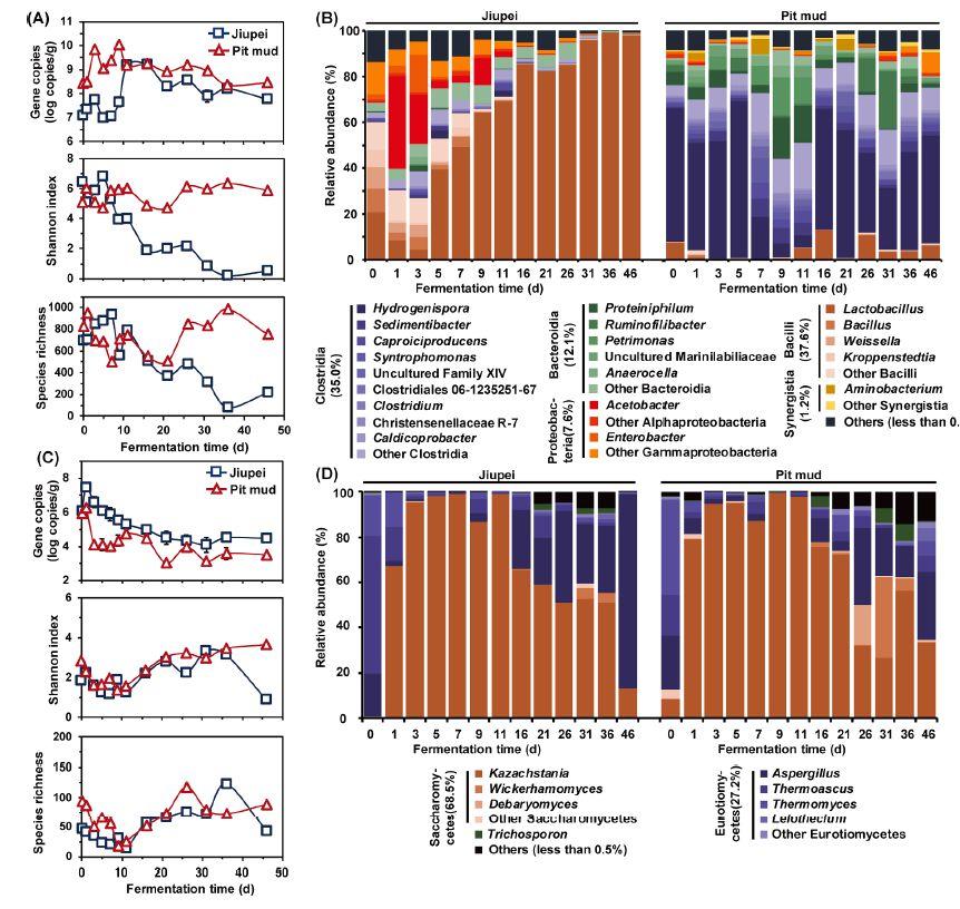 利用實時定量PCR的生物量分析表明,細菌在發(fā)酵過程中占微生物群落的主導地位,此外聚類和主坐標分析(PCoA)分析顯示酒胚和窖泥的細菌群落存在顯著差異。Unisense微電極系統(tǒng)被用于監(jiān)測發(fā)酵過程中酒胚和窖泥的氧氣含量變化,研究人員能夠在白酒發(fā)酵過程中實時監(jiān)測氧氣濃度的變化,從而更好地理解發(fā)酵過程中微生物的代謝活動和氧氣利用情況。酒胚中細菌群落多樣性在發(fā)酵過程中顯著降低,在窖泥中相對穩(wěn)定。乳酸菌屬在發(fā)酵谷物中菌群落中占主導地位,其相對豐度在發(fā)酵結束時達到98.0%。梭狀芽胞桿菌(相對豐度:42.9-85.5%)是窖泥中最豐富的細菌,主要分布在氫孢菌屬(5.3-68.4%)。發(fā)酵谷物和窖泥的真菌群落表現(xiàn)出相似的演替模式,其中Kazachstania、Aspergillus和Thermoascus是優(yōu)勢屬。PICRUSt分析表明,參與乙酸和乳酸生物合成的酶主要富集在九平樣品中,而窖泥中的細菌群落表現(xiàn)出更大的丁酸和己酸合成潛力。體外模擬發(fā)酵的分析進一步驗證了九平微生物群在乙酸和乳酸生產(chǎn)中的作用,這些酸隨后被坑泥微生物群代謝為丁酸和己酸。本研究工作證明了酒胚(發(fā)酵谷物)和坑泥微生物群落之間的協(xié)同合作,以形成濃郁風味的白酒的代表性風味。