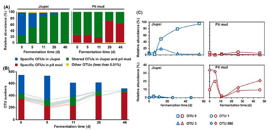 圖4、白酒發(fā)酵窖中不同微生物棲息地之間的細菌流動。(A)直方圖顯示了發(fā)酵谷物和窖泥樣品在發(fā)酵不同階段的共享OTU的相對豐度。(B)跟蹤酒平樣品在不同發(fā)酵階段共享OTU的Sankey圖(矩形的高度與OTU的數(shù)量相關)。(C)發(fā)酵谷物和窖泥中主要OTU的相對豐度動態(tài)。