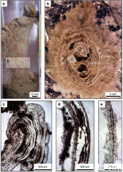 圖4、22.1米深采樣的疊層石2細節。a為采樣時生長方向的疊層石及其下方砂層;b為冷凍干燥切片,方解石區用虛線分隔,標注c–d的近似位置;c為第1區塊狀與針狀方解石薄片顯微照片;d為第2區的層理結構;e為第3區的塊狀方解石。