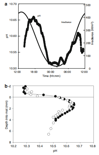 圖3、12.1米深微生物墊微電極調查及輻照度模型。a為2014年11月23-24日的微生物墊擴散邊界層pH隨晝夜變化曲線,疊加了該采樣點的輻照度模型。11月24日實際輻照度因云層影響波動大于模型。b為2014年11月23日近太陽正午時兩條微電極穿過微生物墊的pH剖面(白點與黑點)。
