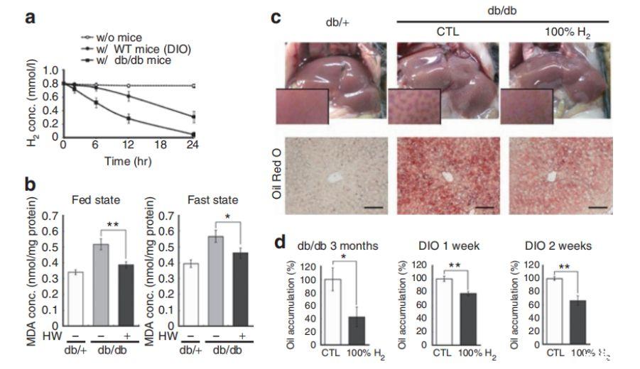 圖2、消耗氫抑制肝臟氧化應激并改善脂肪肝。(a)在“方法與步驟”部分描述的玻璃容器中測量不含小鼠時的氫濃度(空心圓),顯示設備能保留氫。給予db/db小鼠(實心方塊)或用于飲食誘導肥胖(DIO)的野生型小鼠(實心圓)的玻璃容器中飲用水氫濃度變化曲線,表明消耗水時氫氣釋放到空氣相中。數據為平均值±標準差(n=3)。(b)測量飽食或過夜禁食肝臟中的丙二醛濃度。Db/+和db/db小鼠給予含或不含氫的水3個月。數據為平均值±標準誤(db/+組每組n=10,db/db組每組n=15)。*P<0.05,**P<0.01。(c)分別給予含和不含氫的水3個月的db/+和db/db小鼠肝臟的外觀和代表性油紅O染色。比例尺:100μm。(d)肝臟中脂肪積累水平。Db/db小鼠給予含或不含氫的水3個月(左圖)。DIO(高脂飲食誘導肥胖)小鼠給予含或不含氫的水1或2周(中圖或右圖)。使用圖像分析程序ImageJ根據油紅O染色計算肝臟中的油積累。